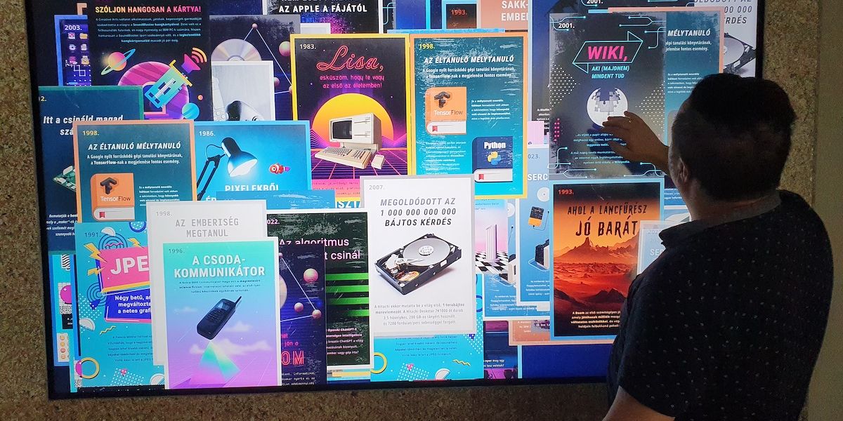 A digitális plakátokon, érdekes, meglepő, olykor vicces információkat olvashatunk az elmúlt 40 év digitális történelméből. Hallottál már Lisa-ról? Tudod mi az a Mosaic? Volt a kezedben CD? Tudod mire volt képes a Windows 3.0? – Csak néhány kérdés, amelyekre választ kaphatsz az installációt böngészve.